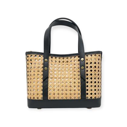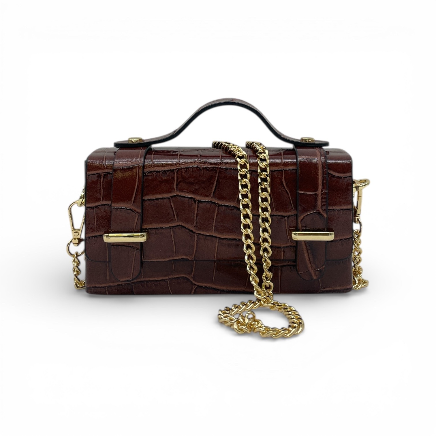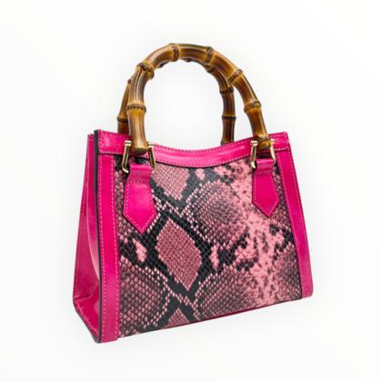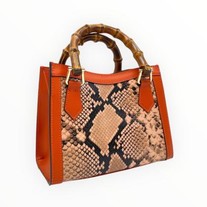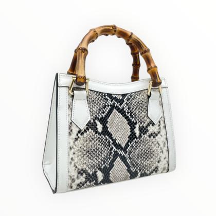 Tasche aus Leder mit Krokodilprägung, Bambusgriff und Schulterriemen
