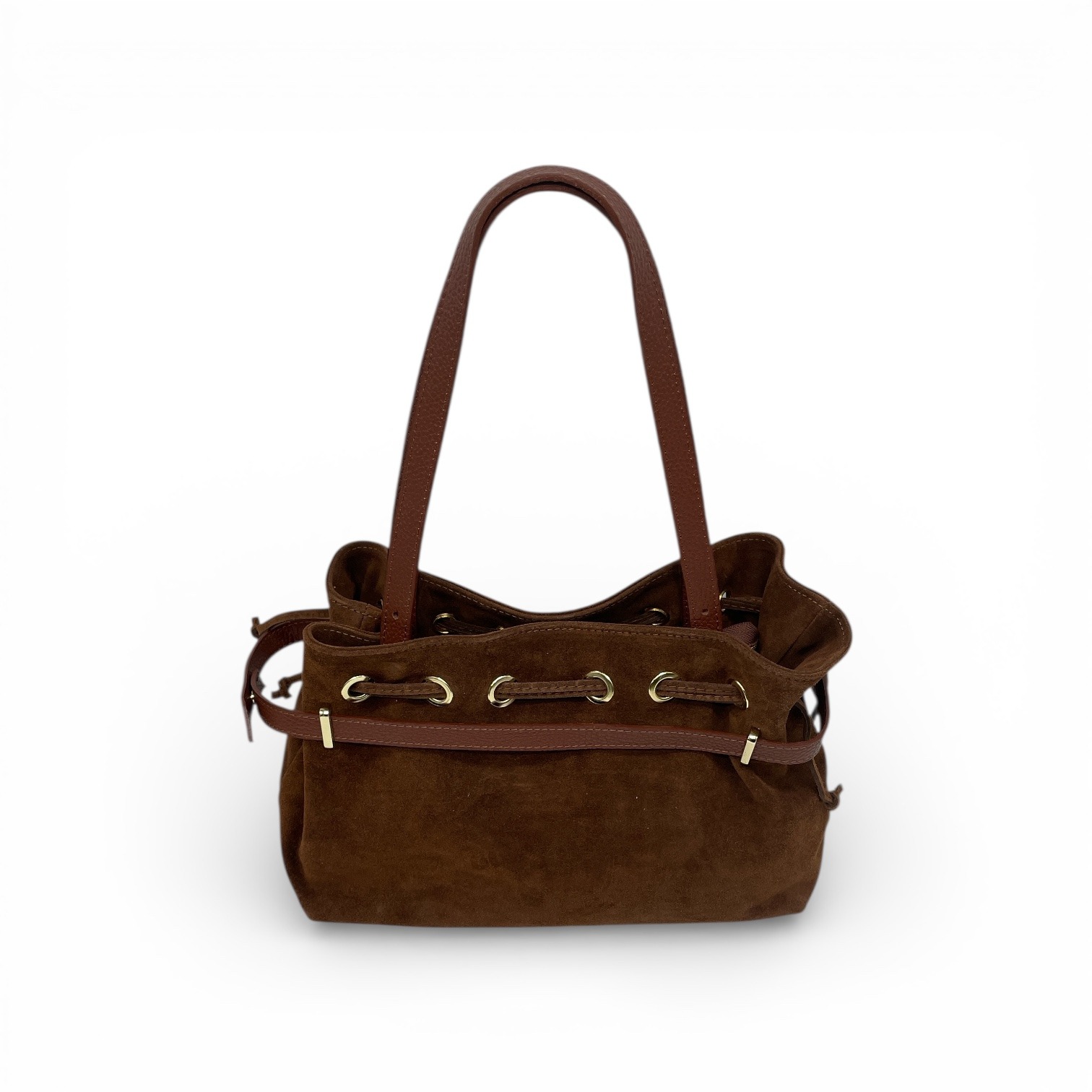 Bolso de ante con un práctico neceser de piel extraíble en el interior.